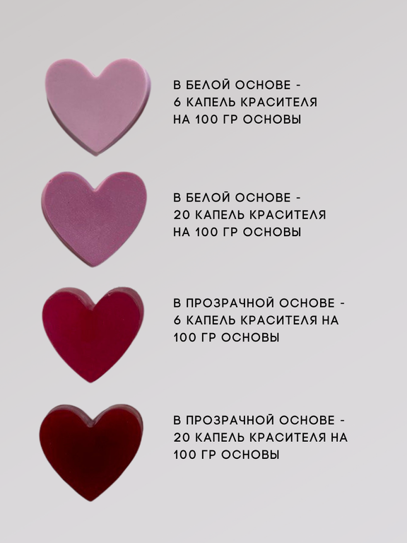 При минимальной дозировке сохраняют прозрачность основы, при большей получается яркий и насыщенный цвет.