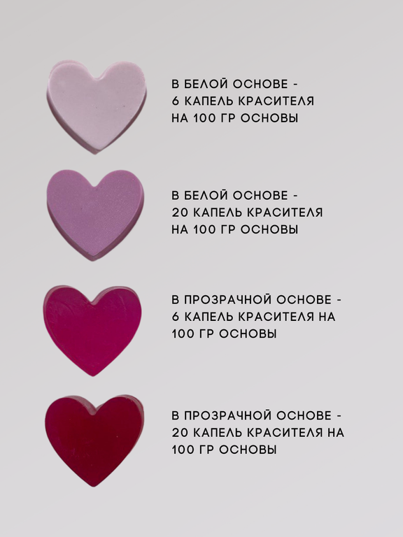 При минимальной дозировке сохраняют прозрачность основы, при большей получается яркий и насыщенный цвет.