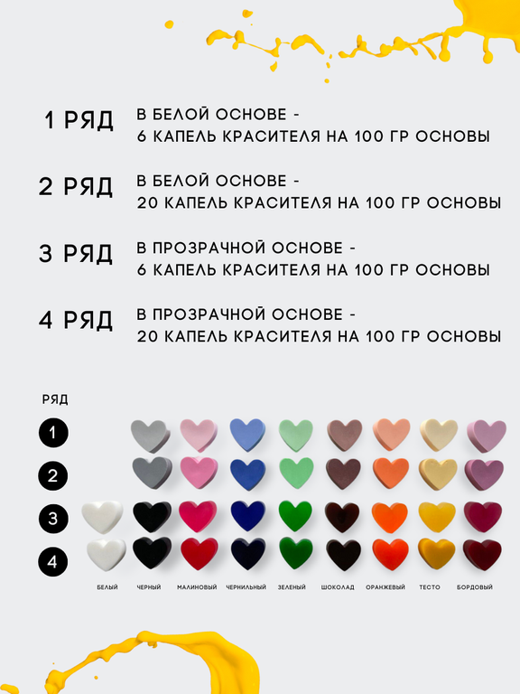 На фото образцы заливок по 6 и 20 капель ( готового, разведенного 1 к 10 пигмента ) на 100 гр основы.